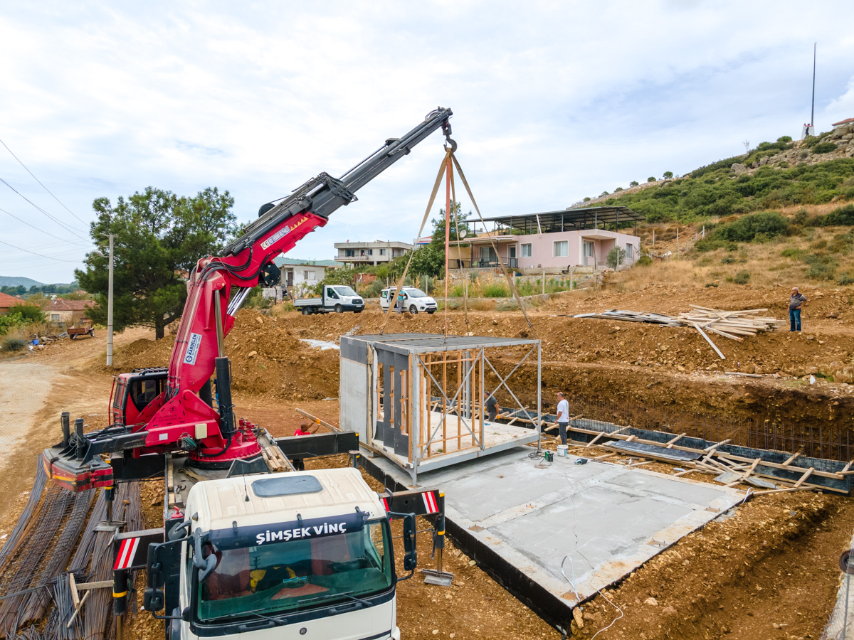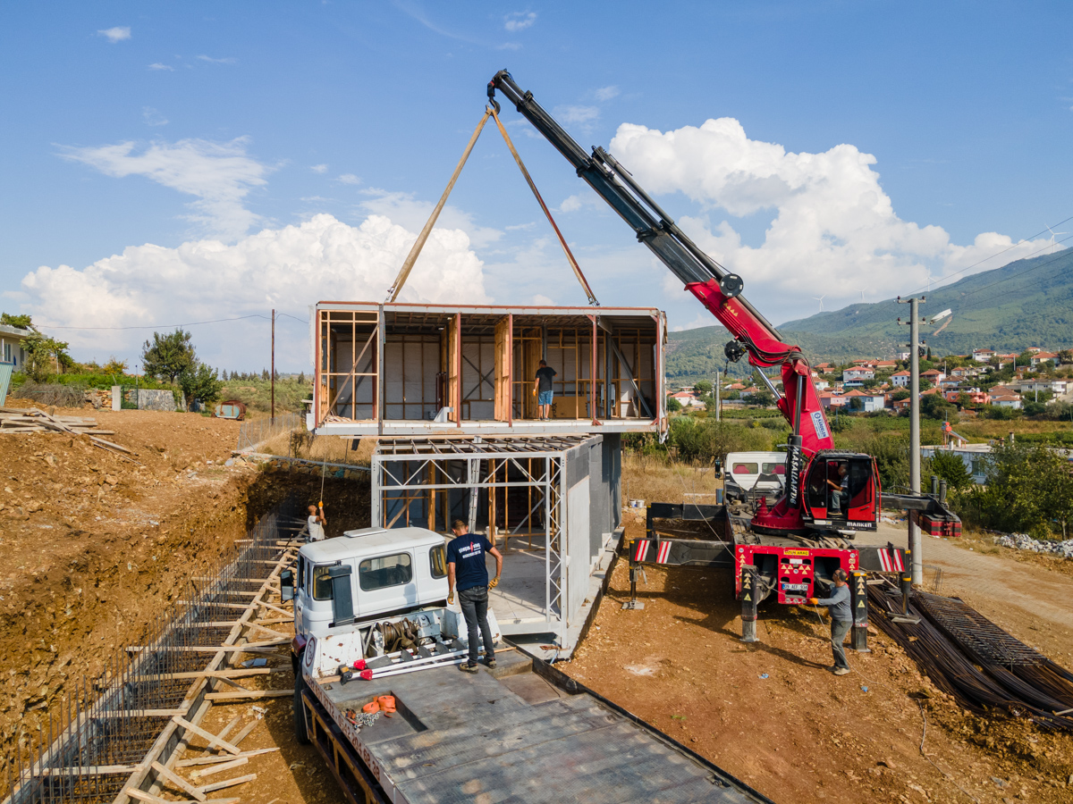 Onaylanan projeye göre, imalata hem sahada hem de fabrikada başlanır. Sahada temel, altyapı ve peyzaj işleri devam ederken, fabrikada ise üst yapı işleri aynı zamanda ilerler. Fabrikada öncelikle ana taşıyıcı çelik modüllerin imalatı yapılır. Daha sonra duvar, zemin ve tavan ünitelerinin imalatına başlanır. Ardından ısı ve su izolasyonu malzemelerinin montajı tamamlanır. Su ve elektrik tesisatlarının döşenmesi ise sonrasında gerçekleştirilir.
